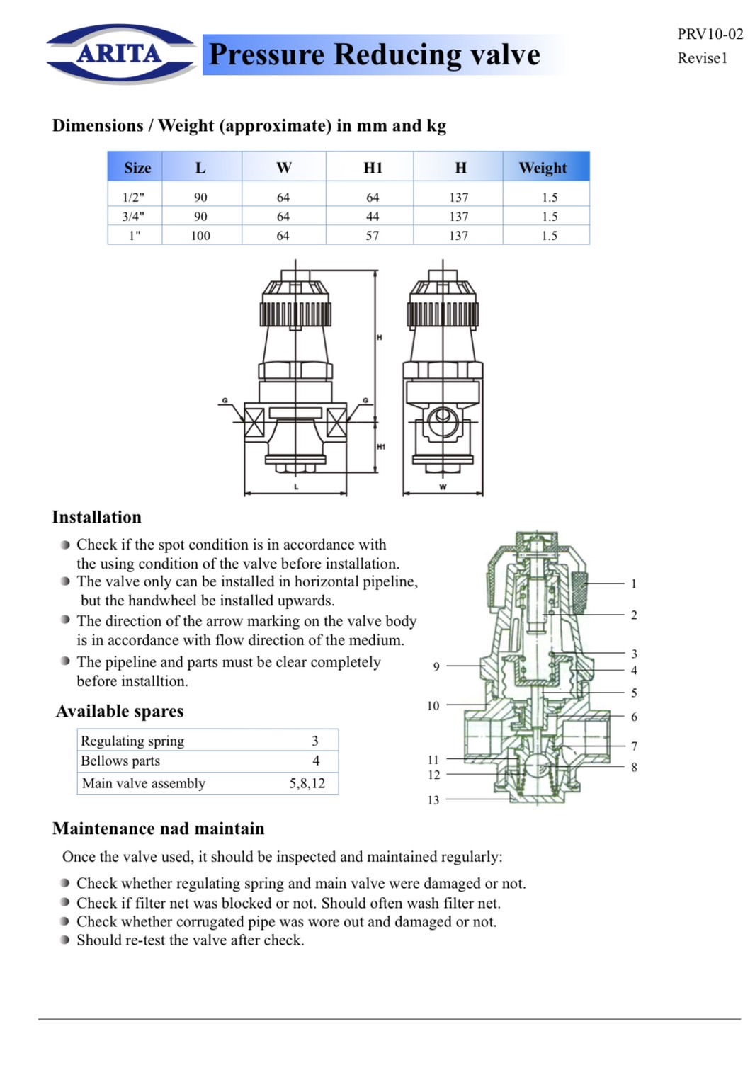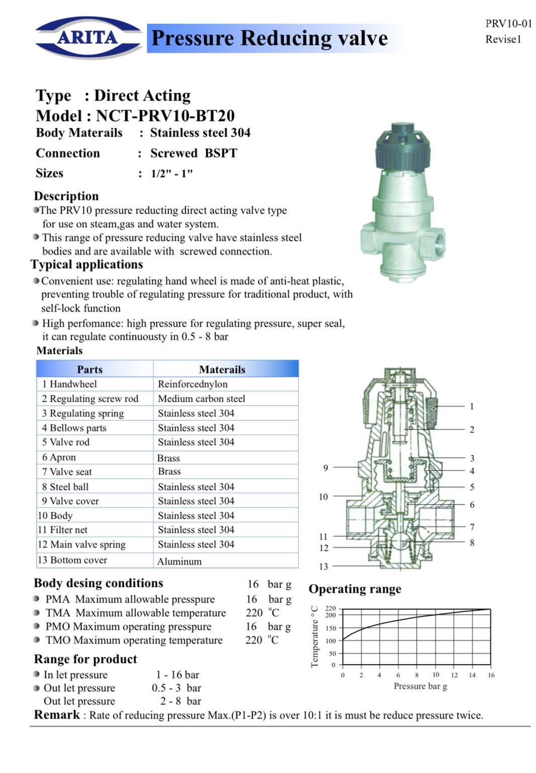 "ARITA" Stainless Steel Pressure Reducing Valve , PRV10