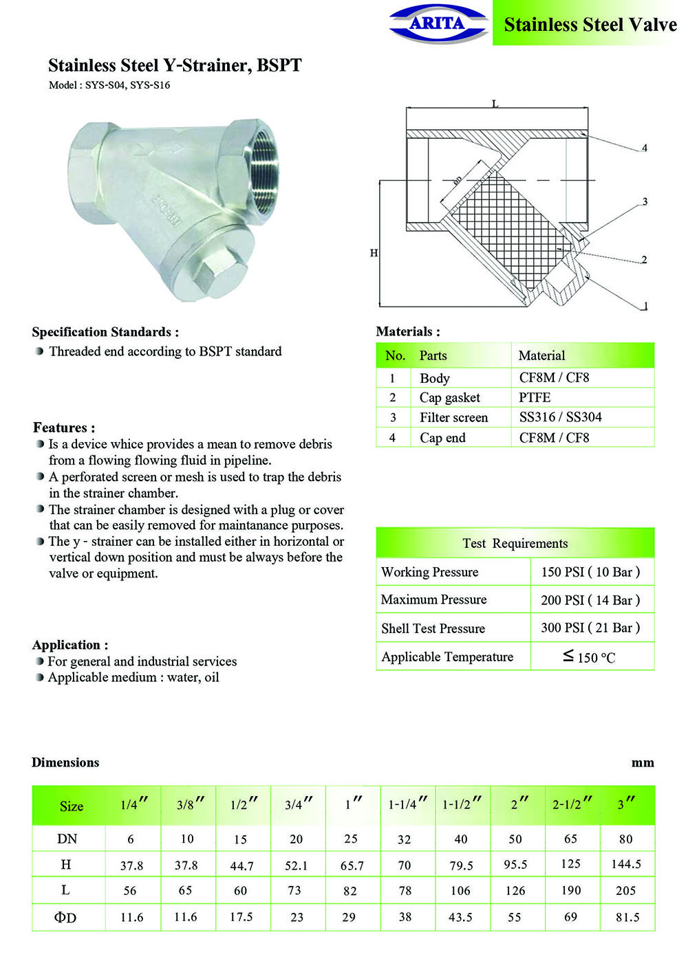 "ARITA" Y-Strainer Stainless Steel , BSPT