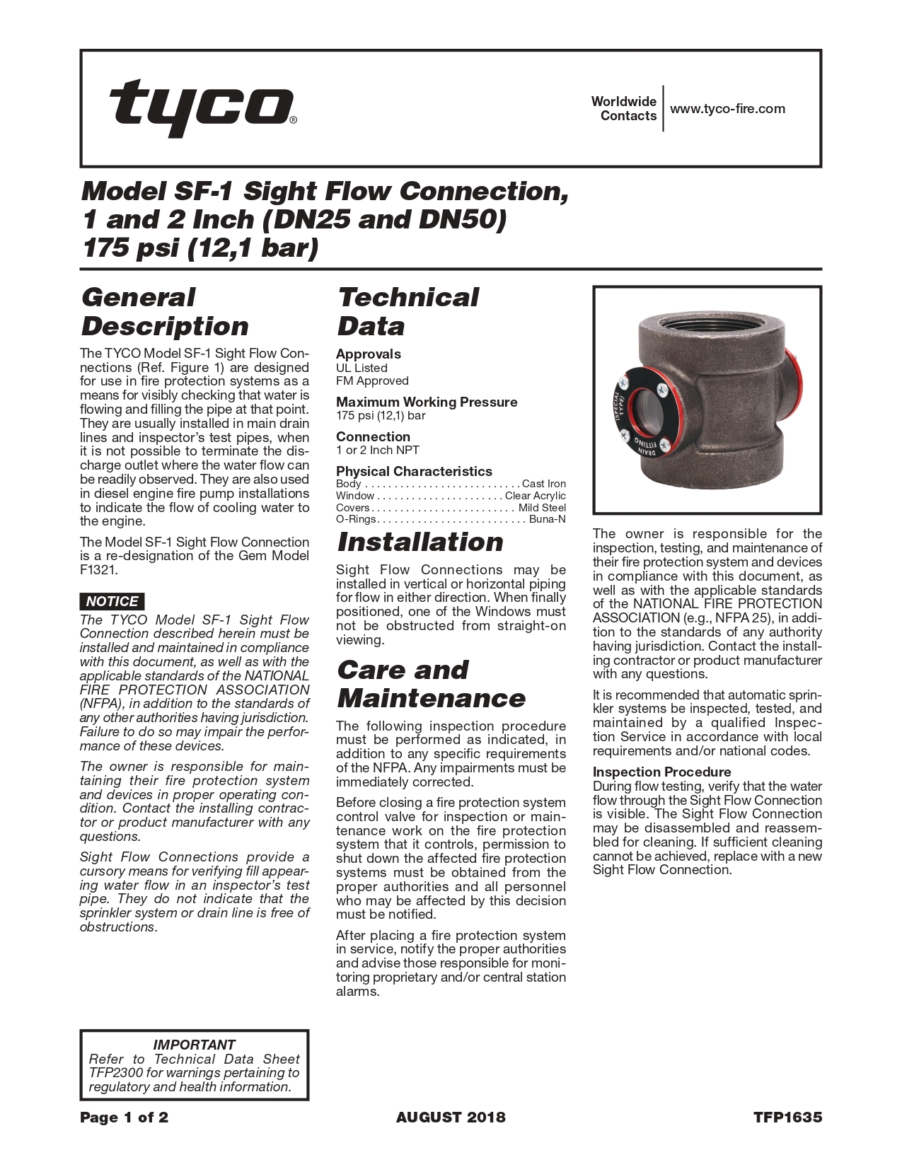 "GEM/TYCO" Sight Flow UL/FM Model SF-1 175 psi.