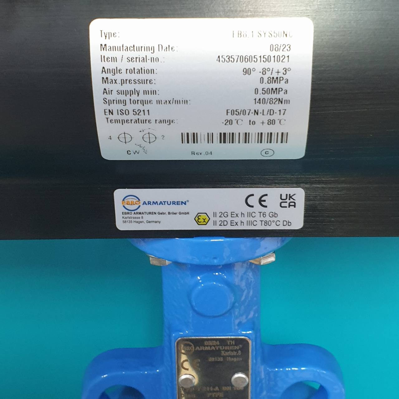 "EBRO" PTFE BUTTERFLY VALVE C/W PNEUMATIC ACTUATOR SINGLE ACTING