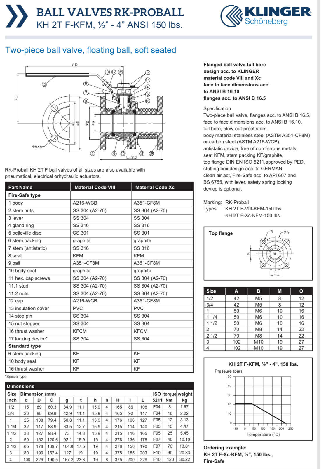 "KLINGER" 2-PCS BALL VALVE, KH 2T F-KFM ,ANSI 150 lbs