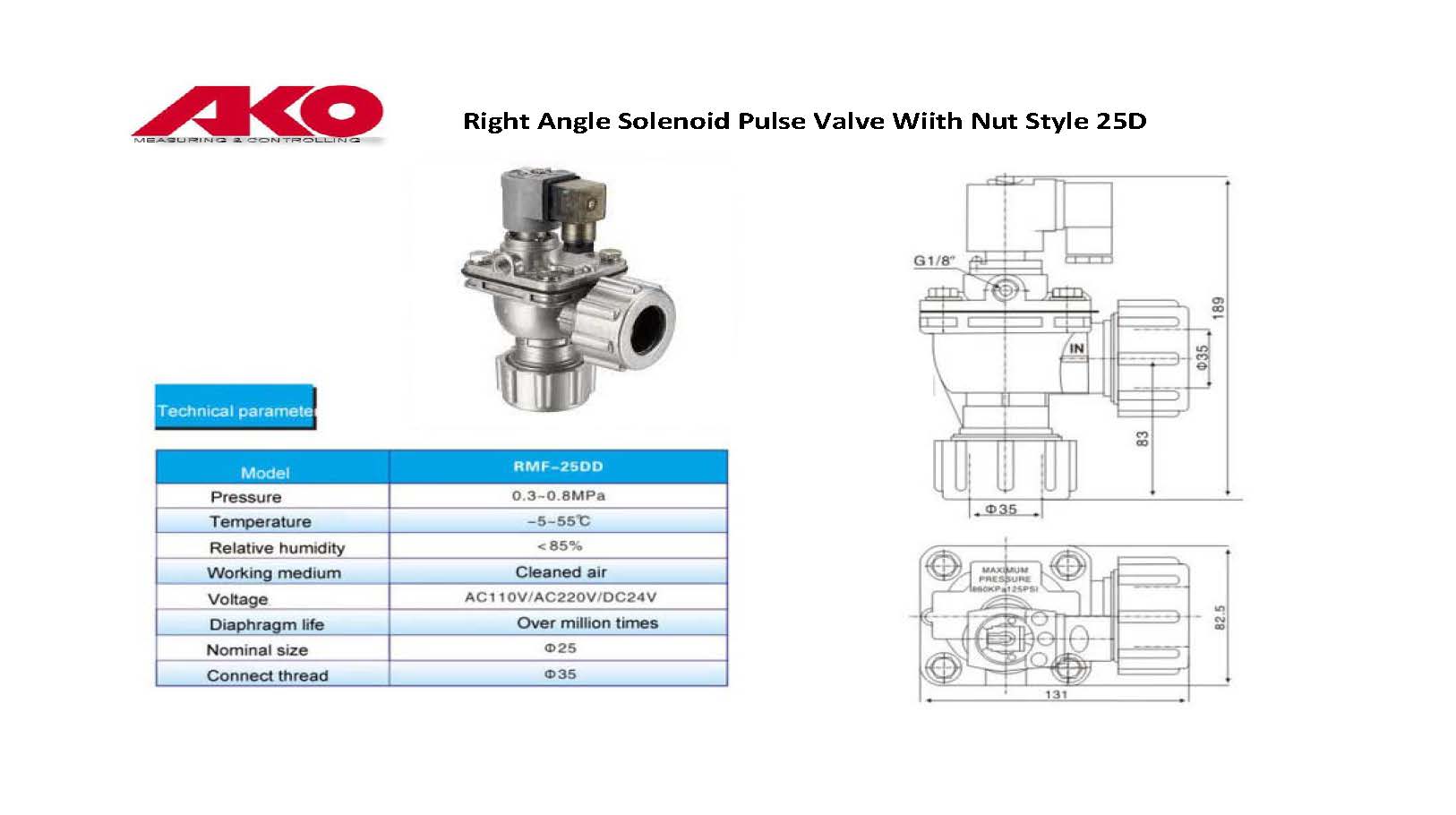Right Angle Solenoid Pulse Valve Wiith Nut Style 25D