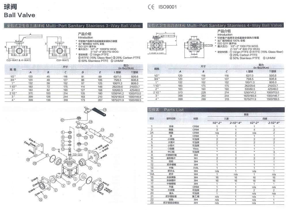 4-PCS SANITARY 3-WAY BALL VALVE (T/L-PORT)