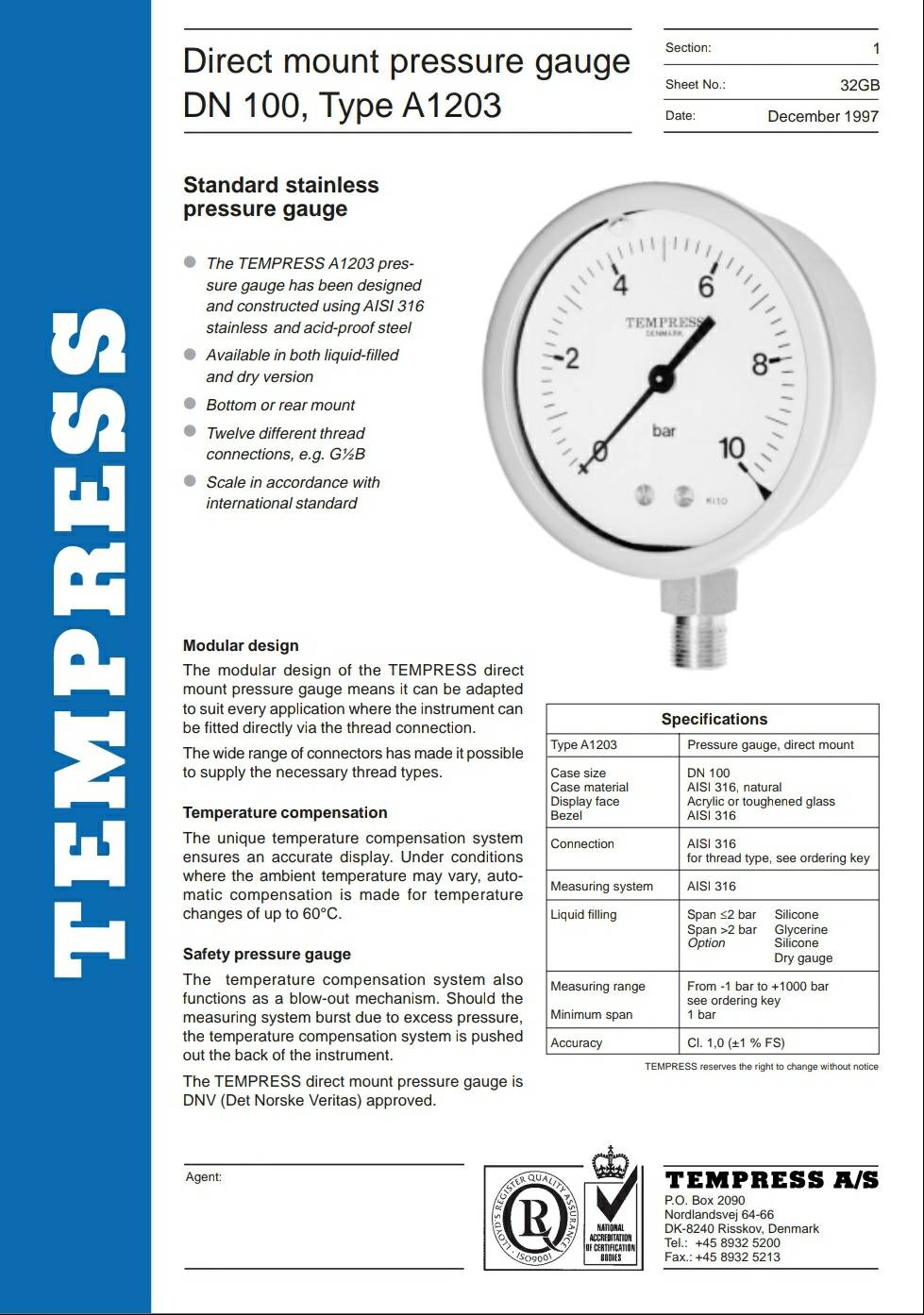 TEMPRESS Direct mount pressure gauge DN 100, Type A1203