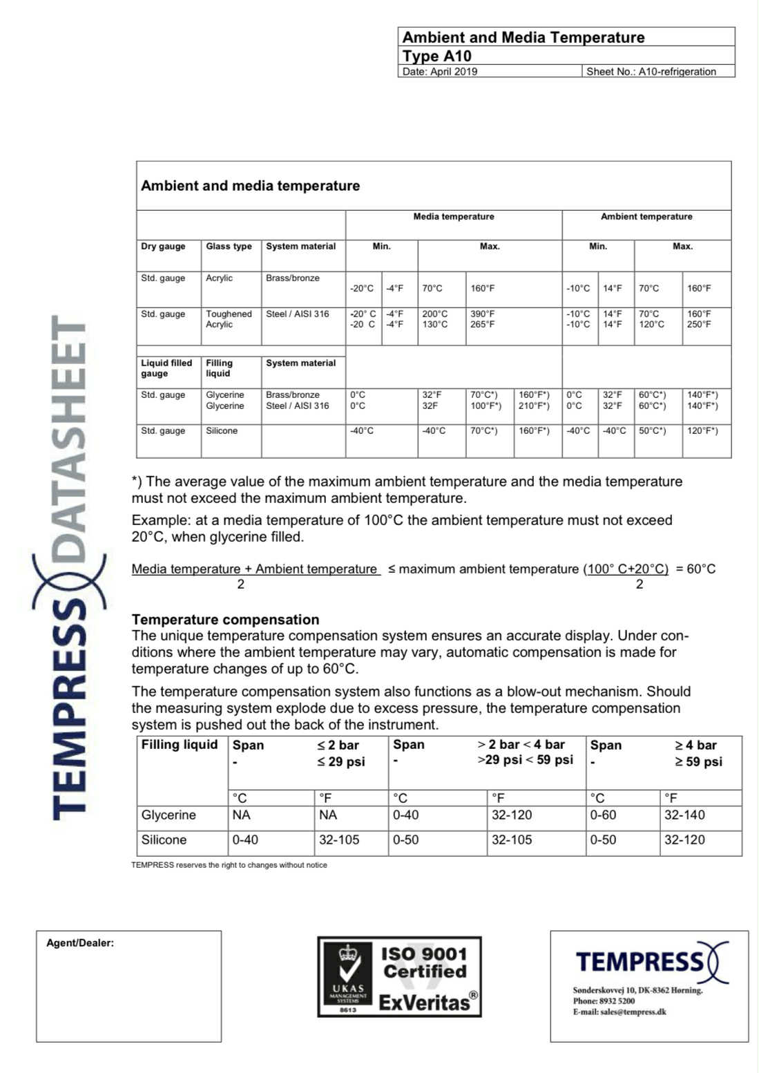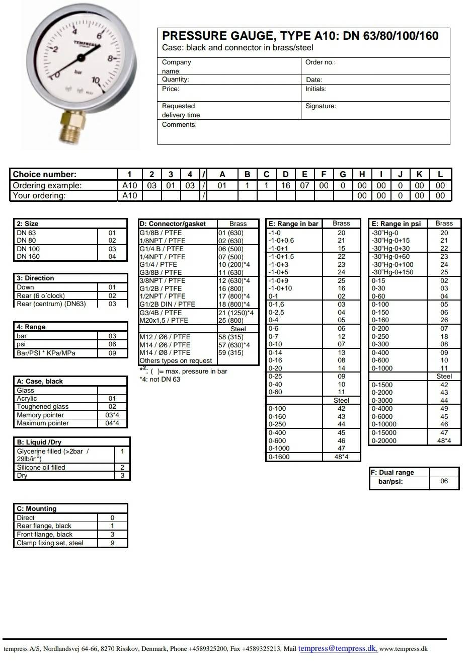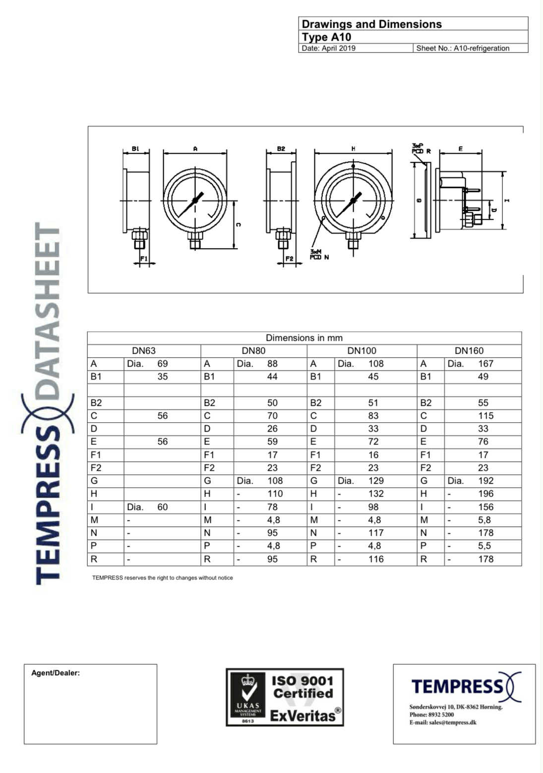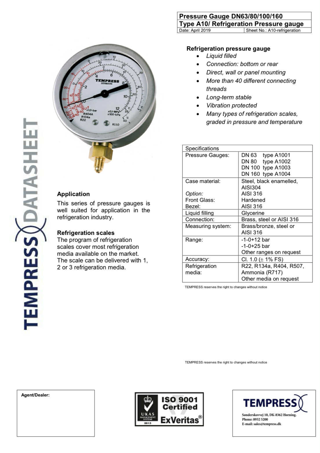 TEMPRESS Pressure Gauge DN63/80/100/160 Type A10 / REFRIGERATION