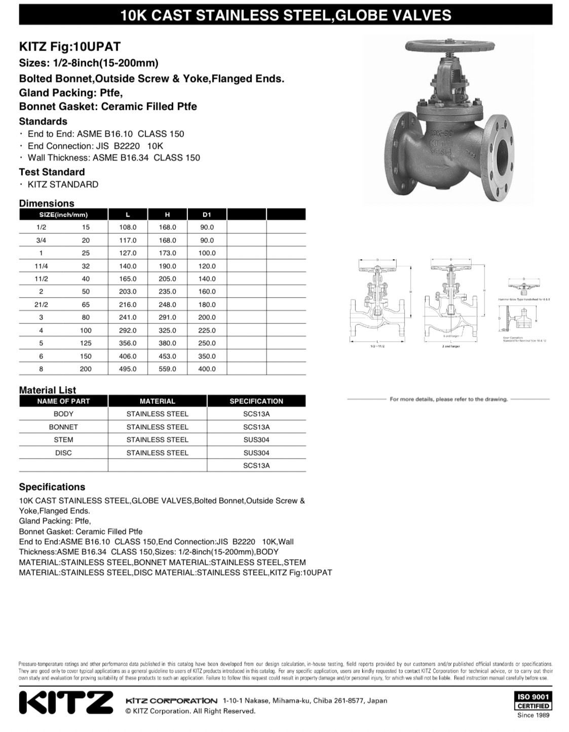 KITZ GLOBE VALVE STAINLESS STEEL , 10UPAT