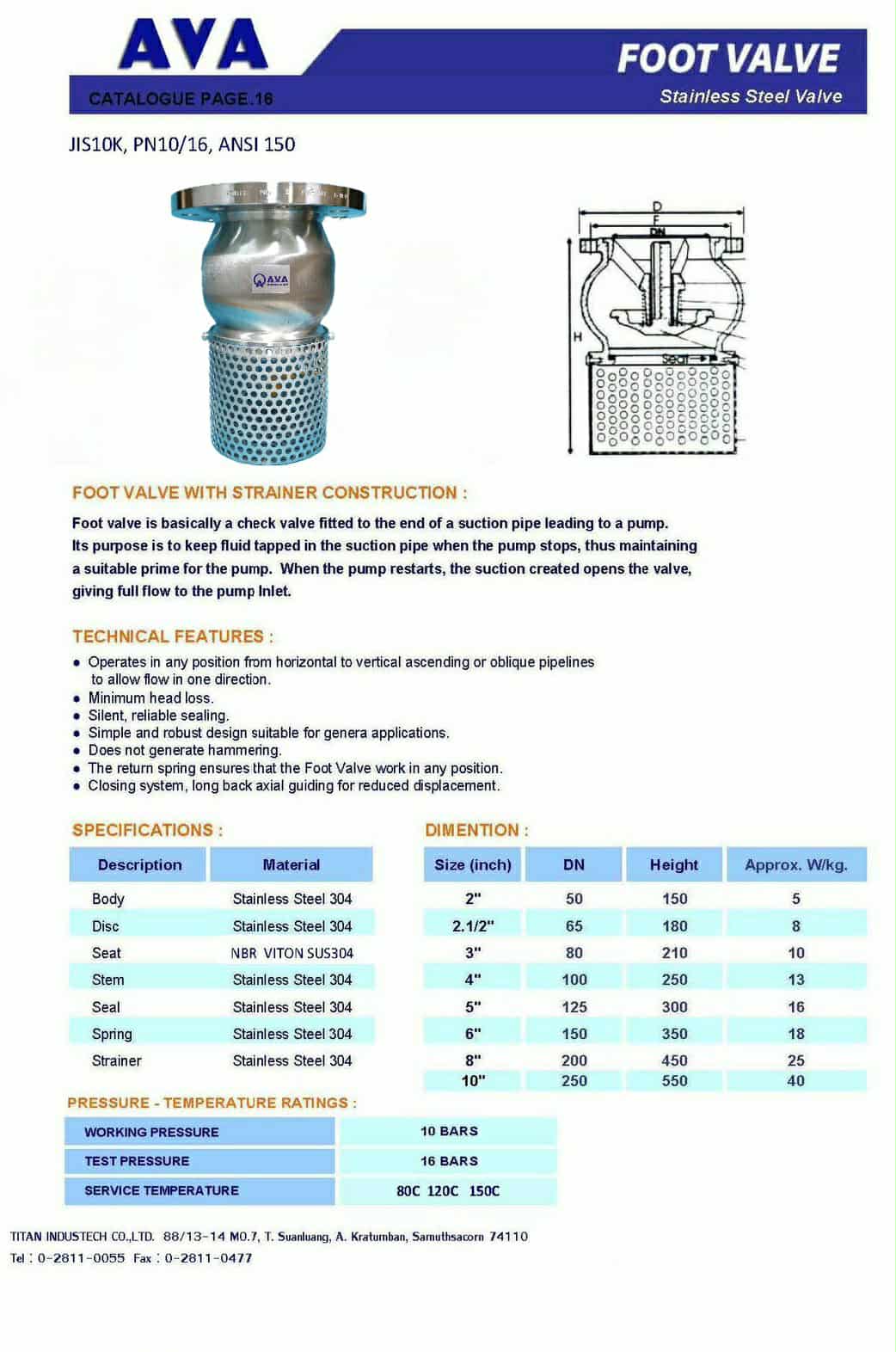 "AVA" FOOT VALVE STAINLESS STEEL 304, FLANGED END