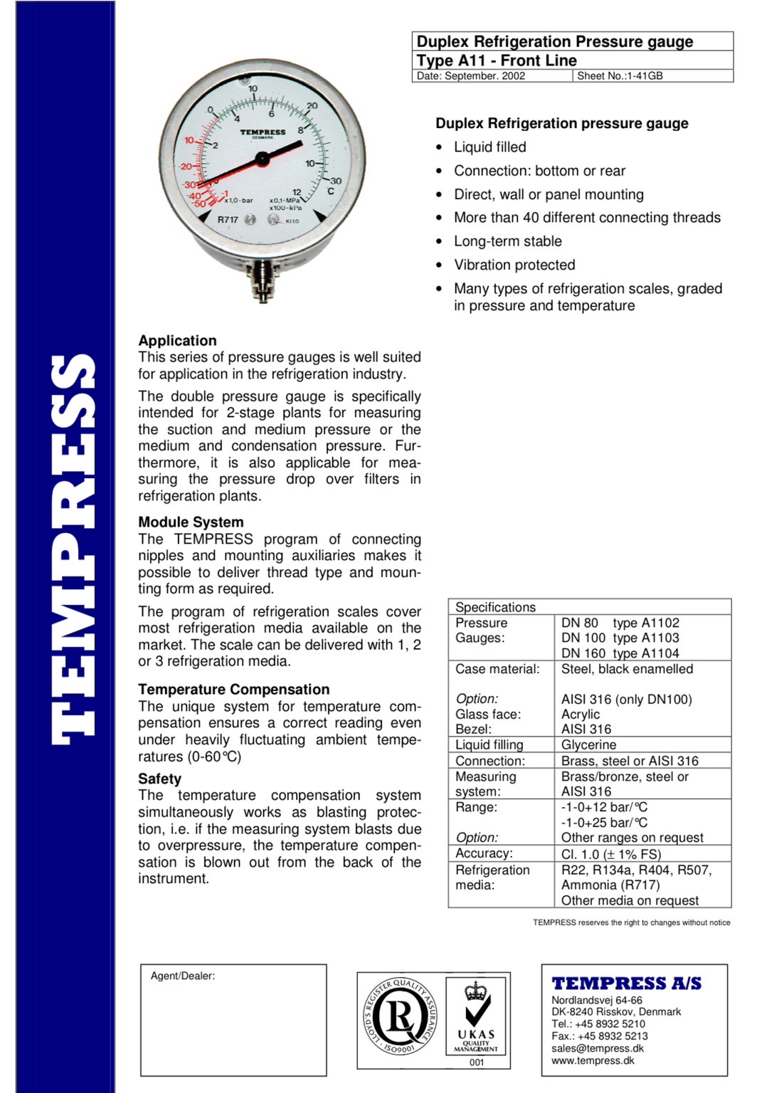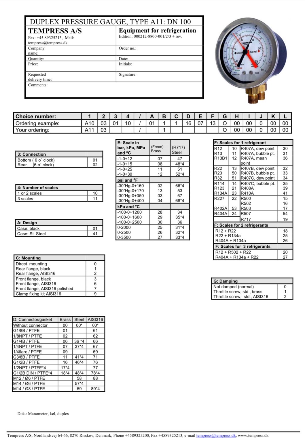 TEMPRESS Duplex Refrigeration pressure gauge Type A11-Front Line