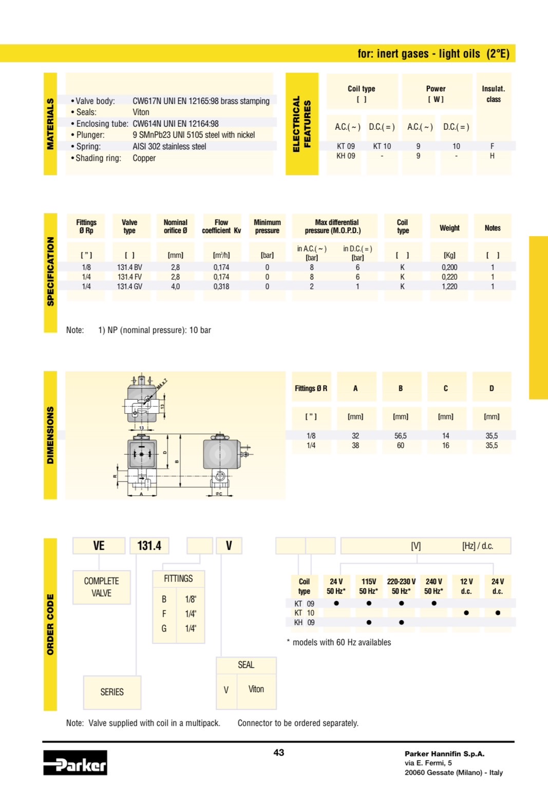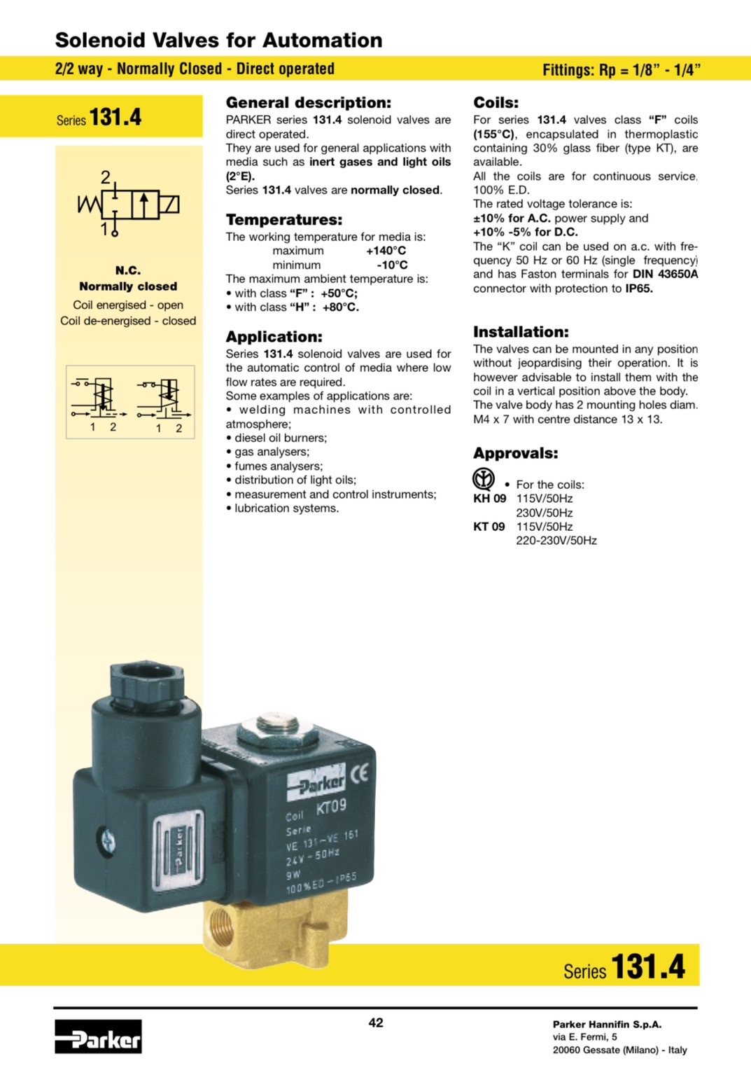 “PARKER” 2/2 Solenoid Valves Viton seal, Direct operated, 131.4, 146, ,174 Series