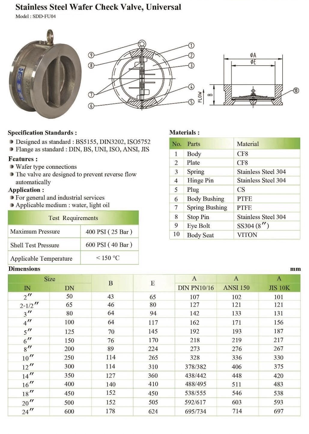 "ART" DUAL PLATE WAFER CHECK VALVE / CF8 /VITON