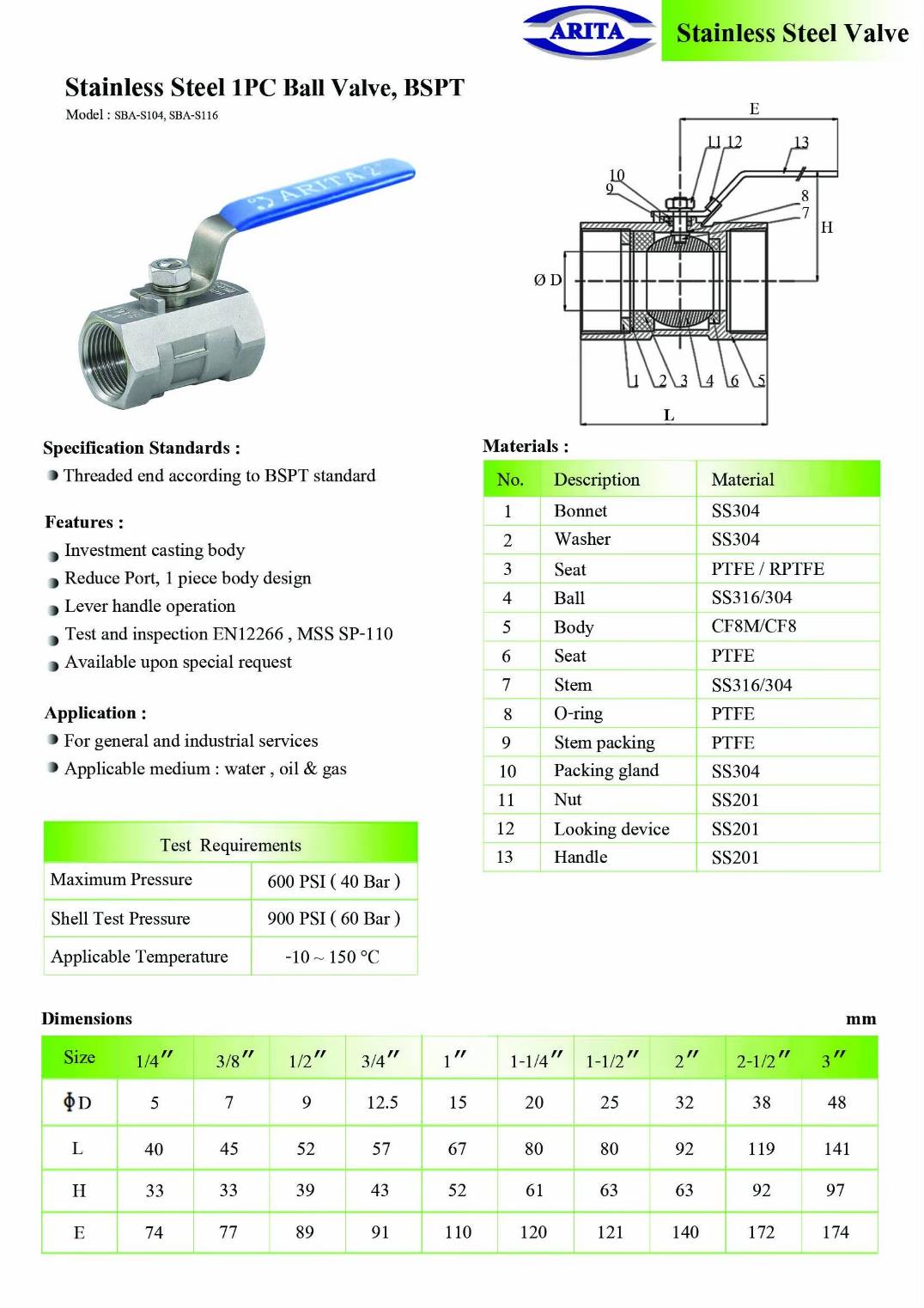 "ARITA" 1-PC STAINLESS STEEL BALL VALVE