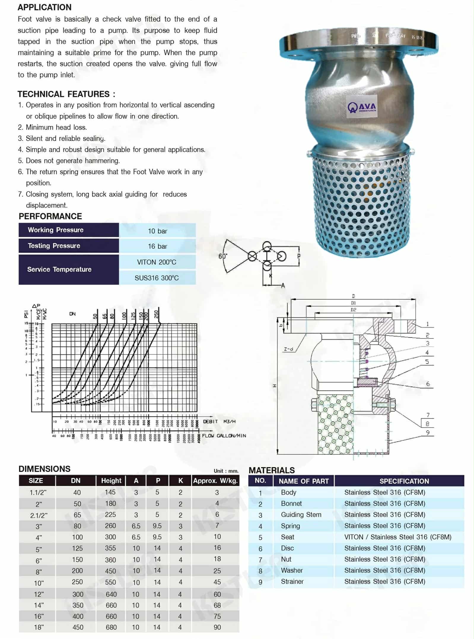 "AVA" FOOT VALVE STAINLESS STEEL 316 , FLANGED END