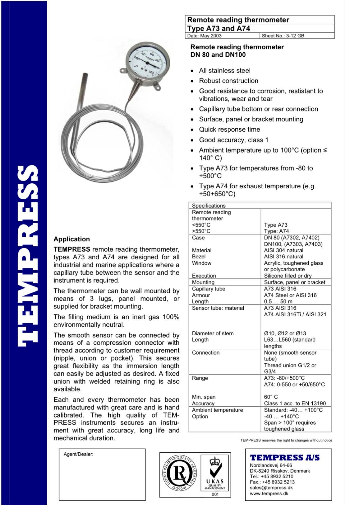 TEMPRESS Remote Reading Thermometer Type A73 , A74