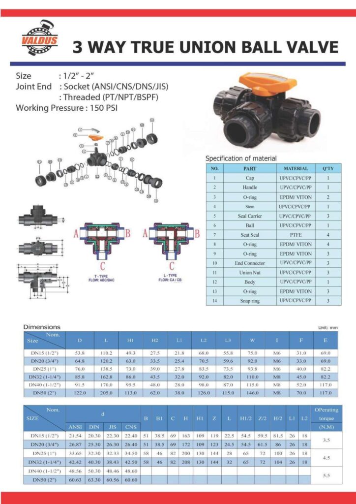 "HYDROSEAL" 3 Way True Union Ball Valve UPVC ,L-PORT