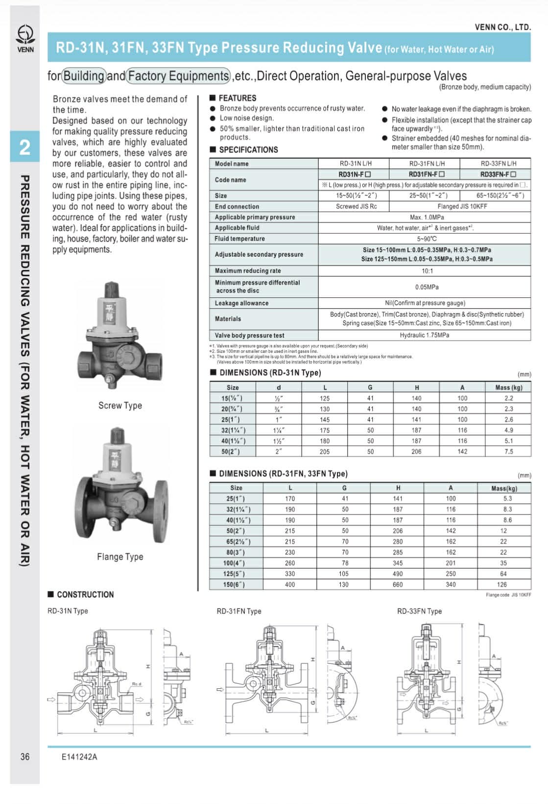 VENN Pressure Reducing Valve type RD-31N,31FM,33FM