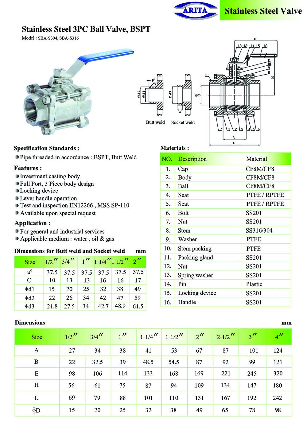 "ARITA" 3-PCS BALL VALVE (Butt weld)