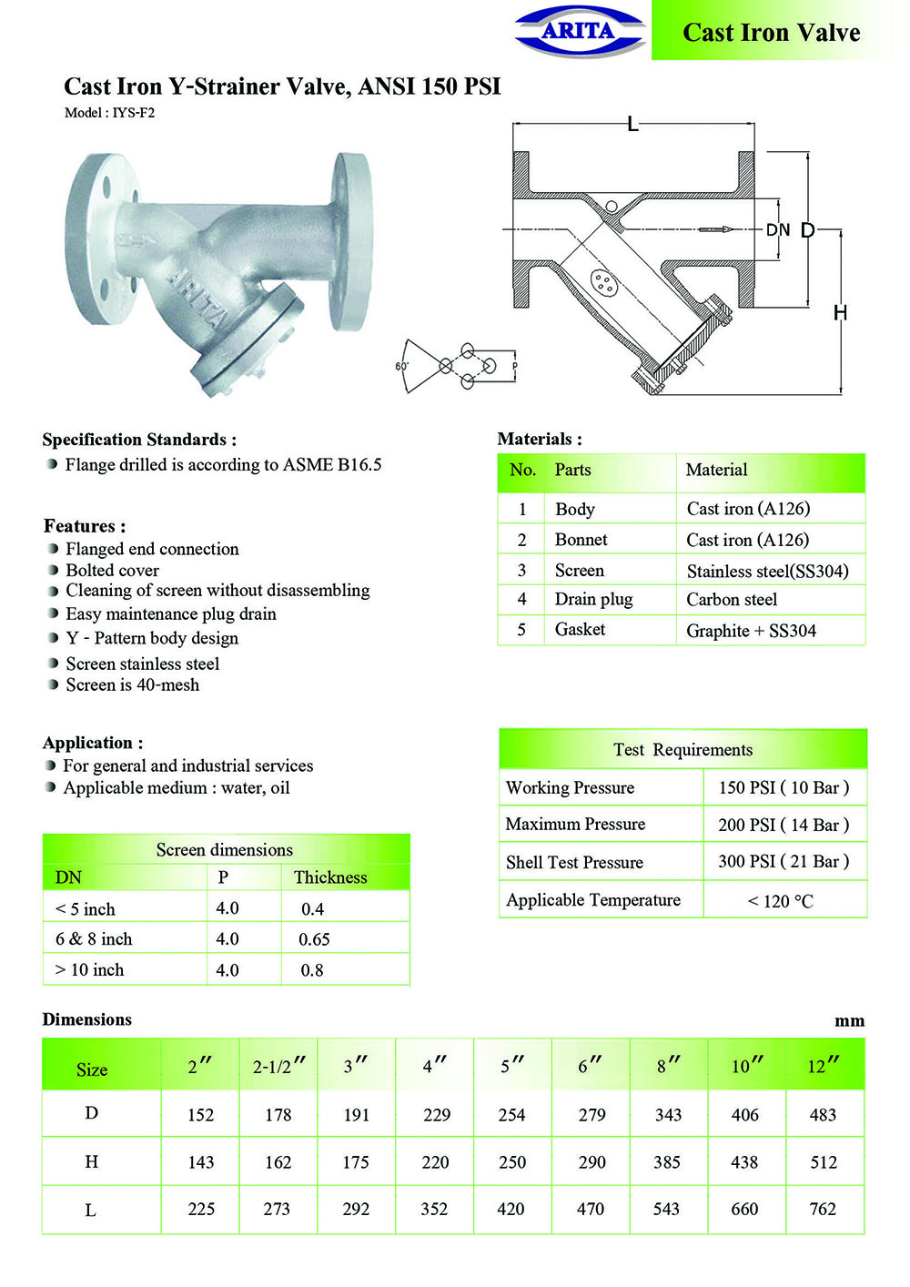 ARITA Cast Iron Y-Strainer, ANSI 150 PSI