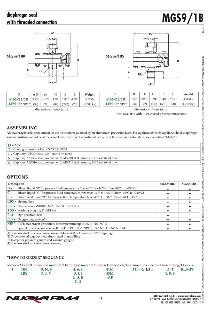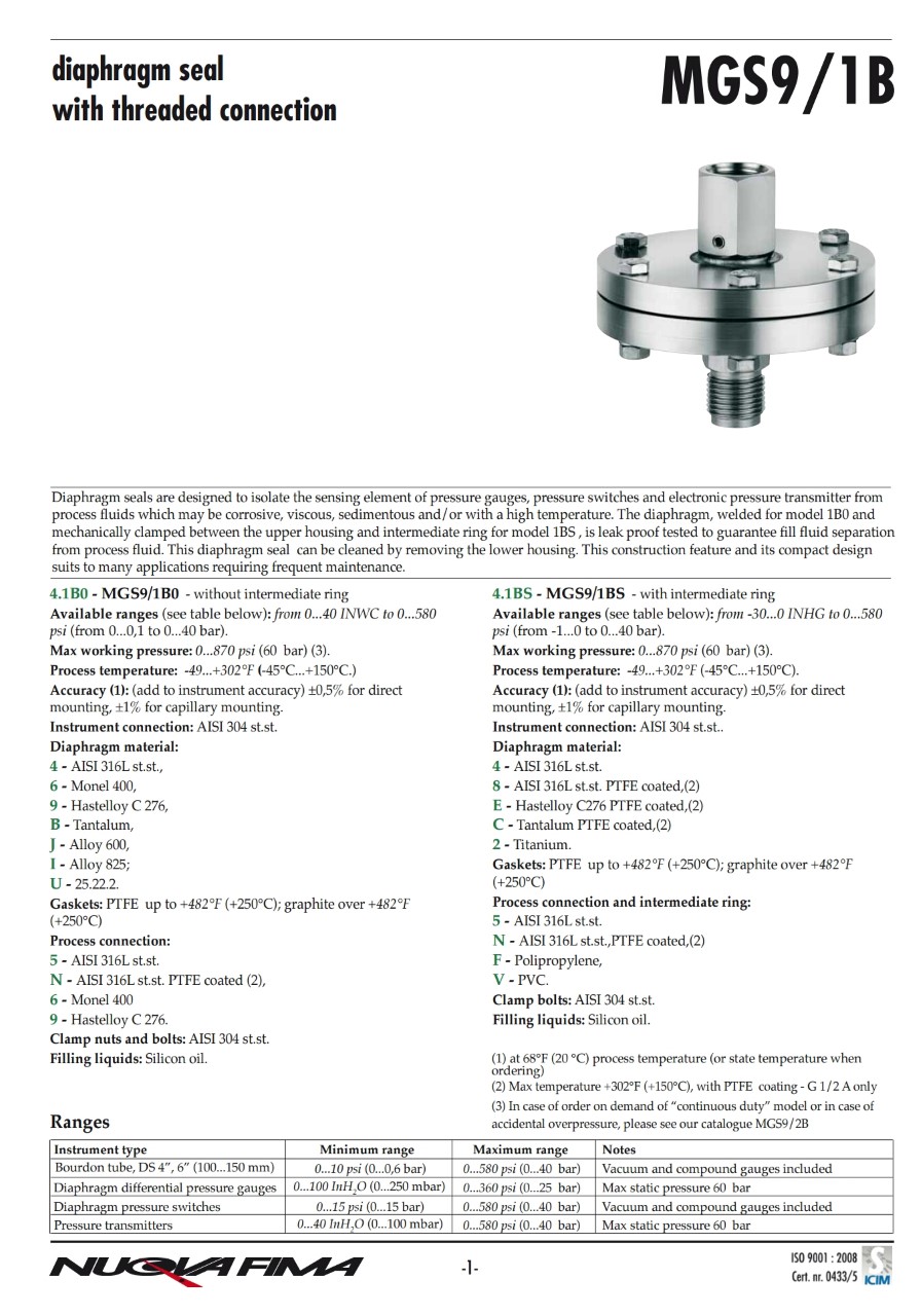 "NUOVA FIMA" PRESSURE GAUGE WITH DIAPHRAGM SEALS