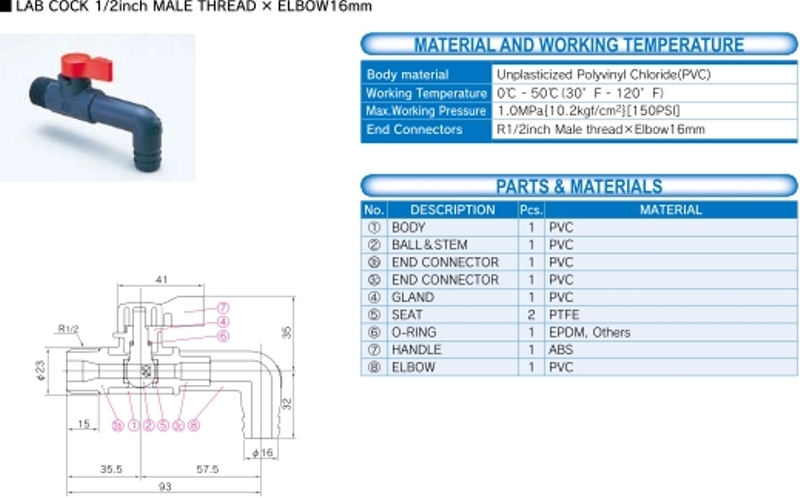 Ball Valve, LAB Cock Male Thread x Elbow 1/2