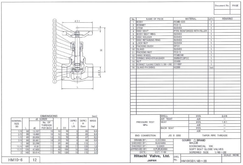"MALL-HITACHI" GLOBE VALVE 10K ,Type PTFE Disc