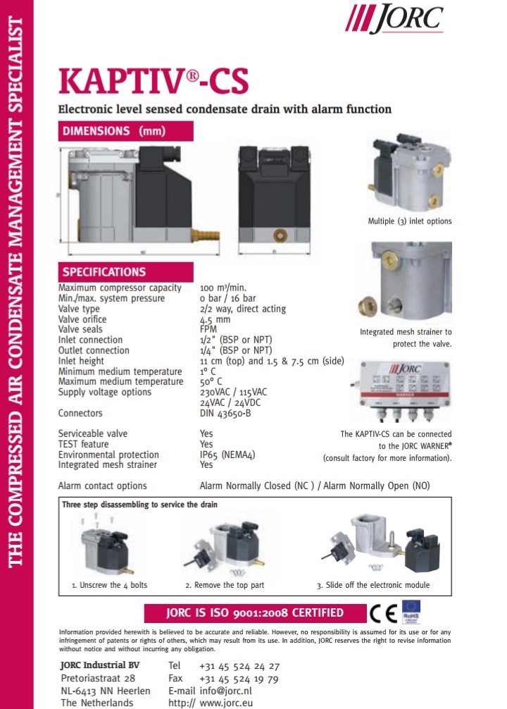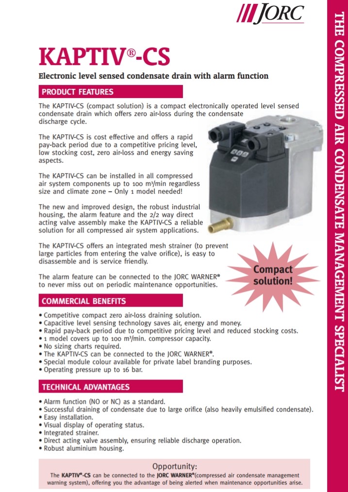 *รุ่น Electronically Operated Zero Air Loss Drain "KAPTIV-CS" KAPTIV-CS เป็นตัวระบายน้ำอัตโนมัติในระบบนิวแมติกส์ ที่ไม่สูญเสียลมอัดในขณะระบายน้ำออกจากระบบ KAPTIV-CS เป็น Solenoid Valve แบบ Direct Operate ที่ใช้สัญญาณจากเซนเซอร์ไฟฟ้าที่อยู่ภายใน เพื่อเปิด- ปิดระบายน้ำ ซึ่งจะตอบสนองได้อย่างรวดเร็ว และแม่นยำ พร้อมทั้งมีฟังก์ชั่นแจ้งเตือนเมื่อมีการทำงานที่ผิดปกติเกิดขึ้น |