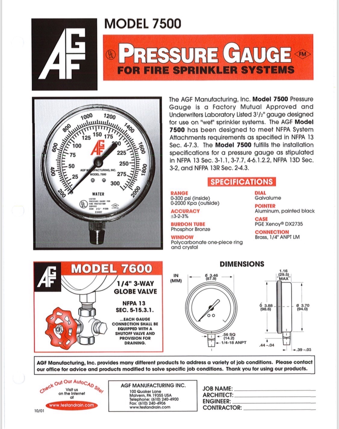pressure gauge AGF 0-300psi มาตรฐาน UL/FM ใช้กับงานดับเพลิง