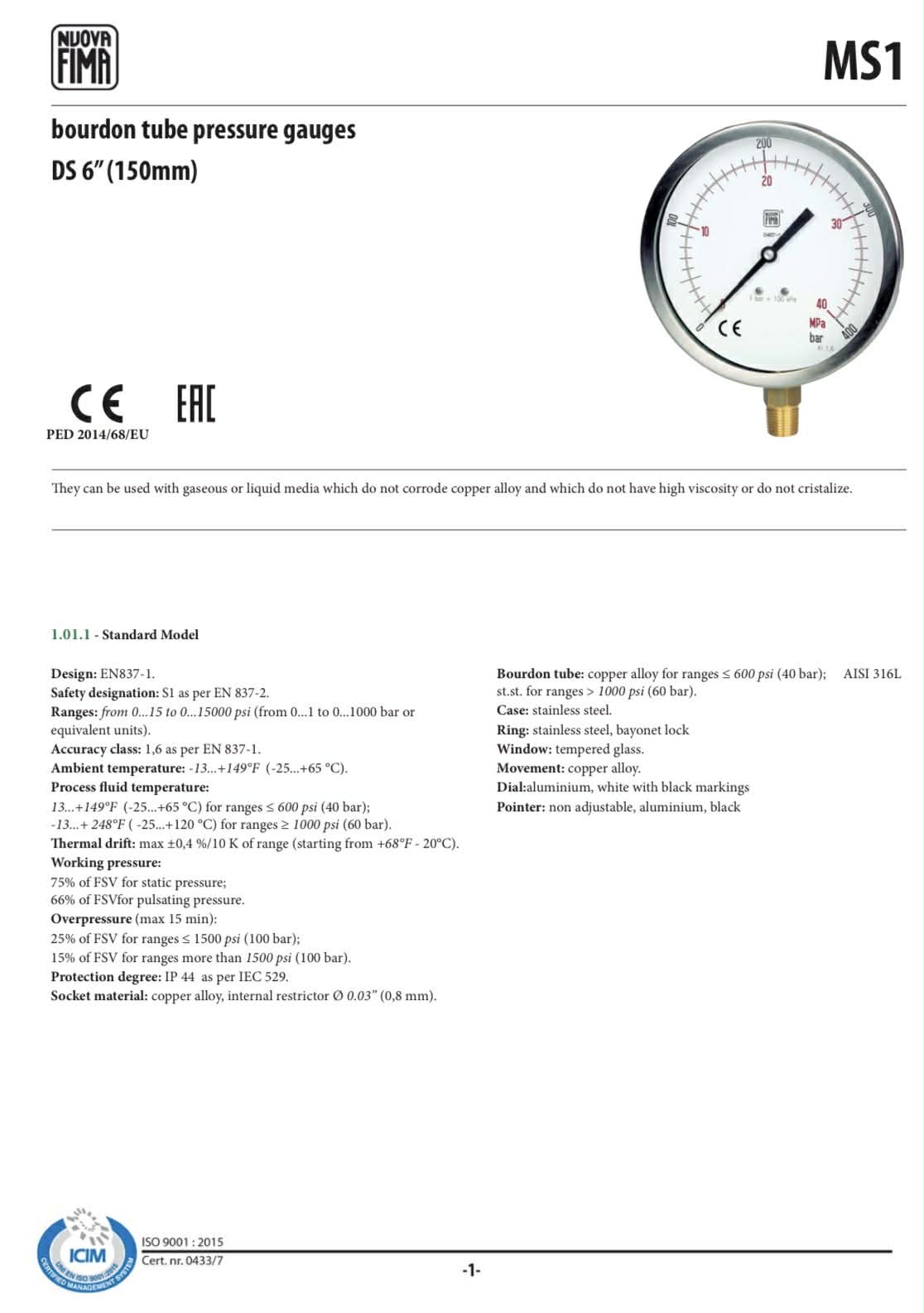 NUOVA FIMA PRESSURE GAUGE DS150 , copper